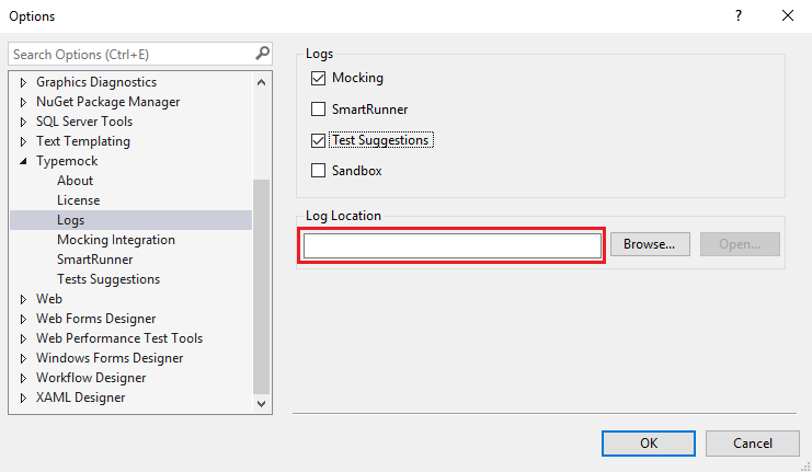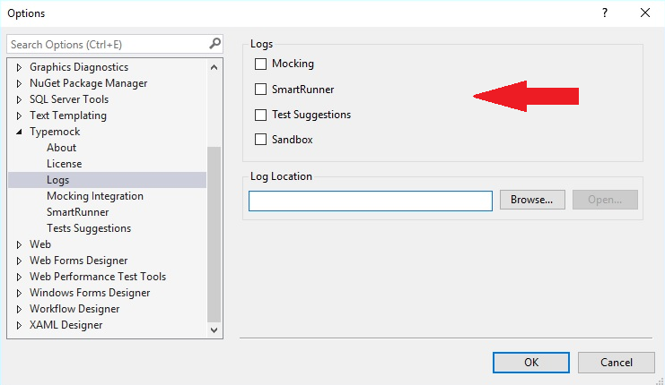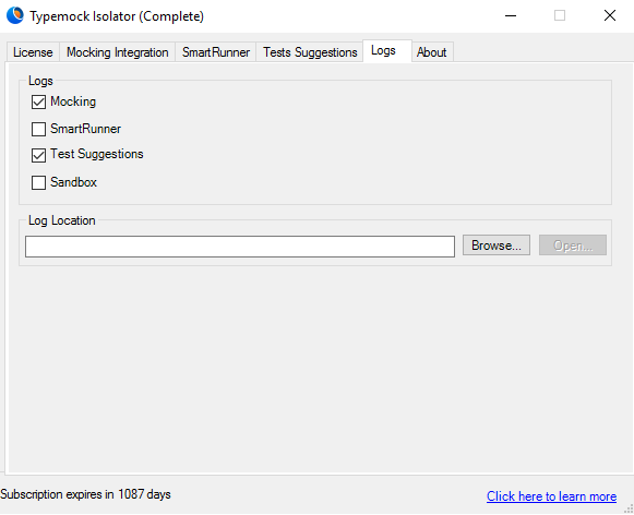 To send your Logs for analyze and support, turn on diagnostic Logs. You will be able to produce Logs for: Mocking, SmartRunner, Test Suggestions and Sandbox. To produce Logs do the following: