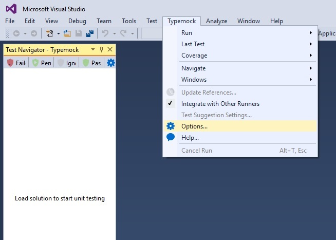 In Visual Studio click on the "Typemock" tab and choose "Options".
