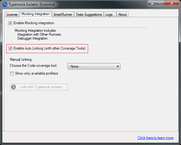 To enable Typemock linking with Code Coverage Tools: