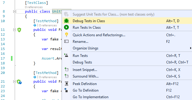 You can debug multiple tests, in the same Test Class or all pending tests, one after another with a single action, Typemock Isolator will add a breakpoint at the beginning of the first test. The debugger will run the test and when it ends it will continue to next one until it finishes. After the debug session will end the breakpoint will be removed.
