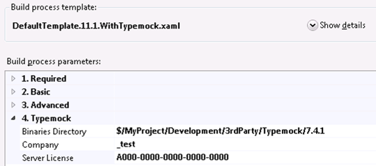 3. In the Build process template, set the AutoDeploy Path field to the source control path to the Typemock AutoDeploy directory.