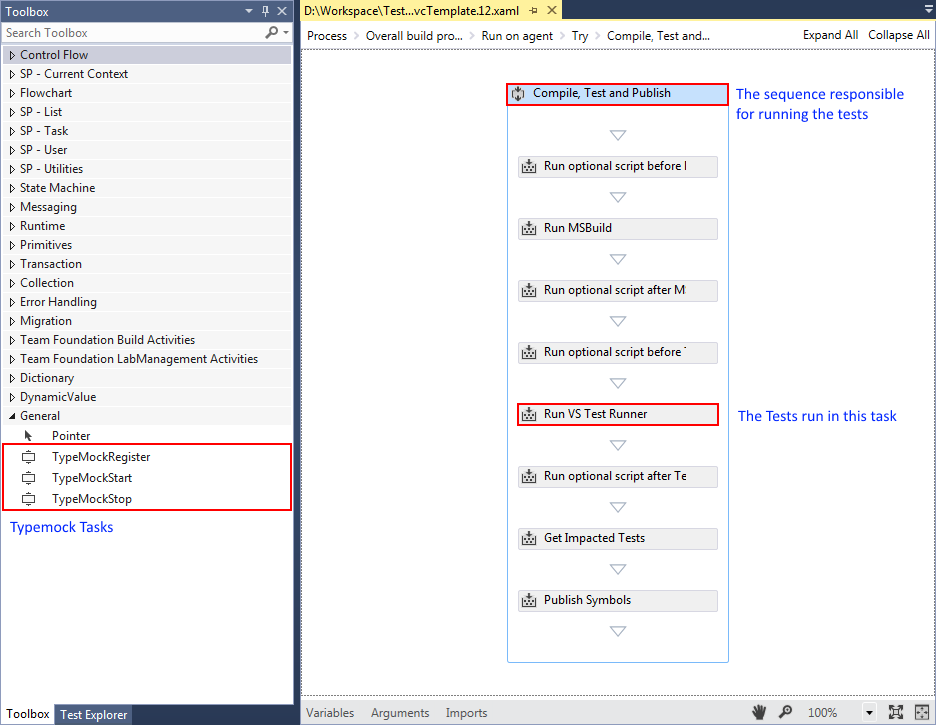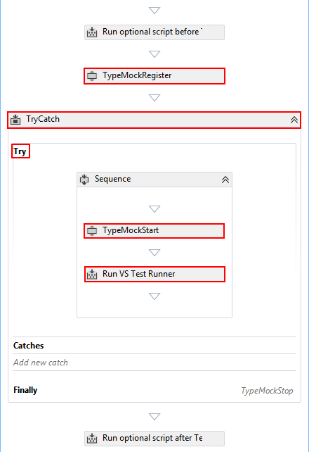 8. Drag a "Run VS Test Runner" control from the "Compile, Test and Publish" sequence and drop it inside the try block in TryCatch control after TypemockStart.