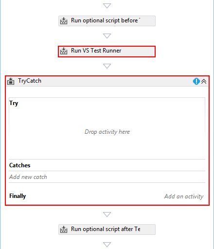 5. Drag a TryCatch control from the Toolbox and drop it after the "Run VS Test Runner" task.