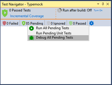 You can debug multiple tests, in the same Test Class or all pending tests, one after another with a single action, Typemock Isolator will add a breakpoint at the beginning of the first test. The debugger will run the test and when it ends it will continue to next one until it finishes. After the debug session will end the breakpoint will be removed.
