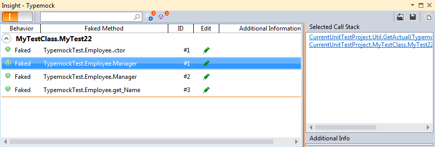 Clicking on a line will show you the call stack of the faked method (where it was called in the test – on the right).